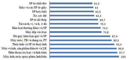 Từ biểu dồ trên, có thể thấy nhiều mặt hàng xuất khẩu được các DN FDI tập trung, đẩy mạnh sản xuất là những nhóm hàng có đầu vào còn rẻ như: hoá chất, sản phẩm hoá chất, chất dẻo nguyên liệu, sản phẩm từ chất dẻo, thủy tinh và sản phẩm từ thuỷ tinh, sắt thép các loại, kim loại thường…
