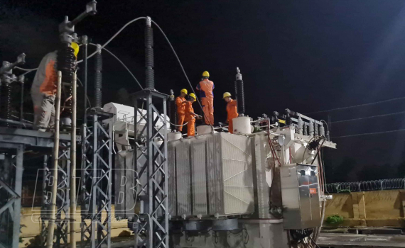 Công nhân Công ty Điện lực Thái Bình tập trung nâng công suất máy biến áp bảo đảm cung cấp điện ổn định, an toàn.