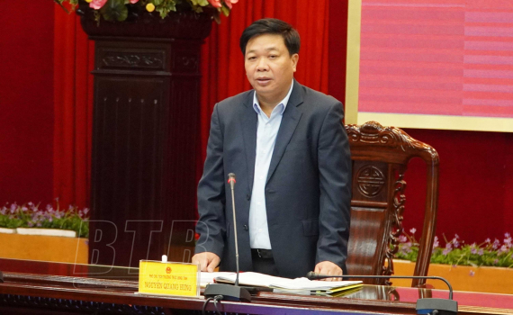 Đồng chí Nguyễn Quang Hưng, Ủy viên Ban Thường vụ Tỉnh ủy, Phó Chủ tịch thường trực UBND tỉnh phát biểu tại cuộc họp.