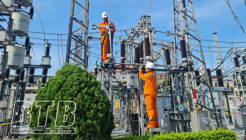Công nhân Công ty Điện lực Thái Bình kiểm tra, bảo dưỡng định kỳ trạm biến áp bảo đảm cung cấp điện ổn định, an toàn.