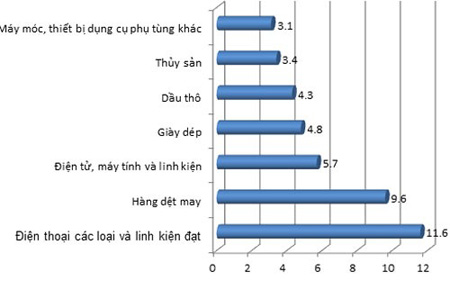 Kim ngạch xuất khẩu một số mặt hàng chủ lực trong 7 tháng năm 2013 (đơn vị: tỷ USD) - Nguồn: Tổng cục Thống kê.