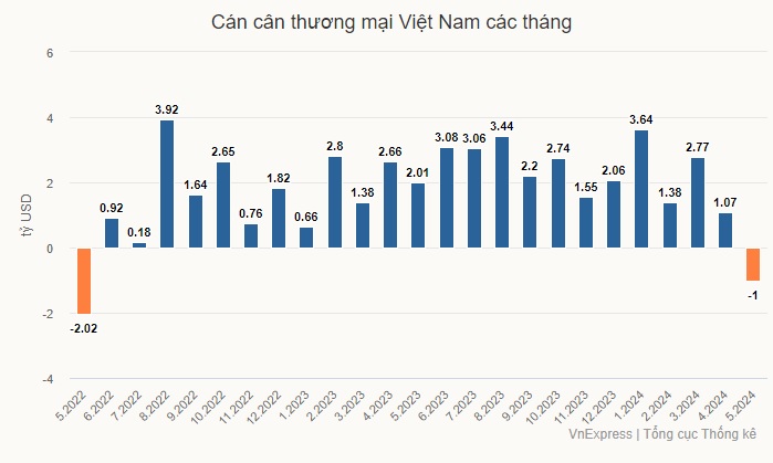 Kết quả, Việt Nam lần đầu có tháng nhập siêu sau gần 2 năm. Lần gần nhất cán cân thương mại hàng hóa ghi nhận nhập siêu là tháng 5/2022, ở mức 2,02 tỷ USD.