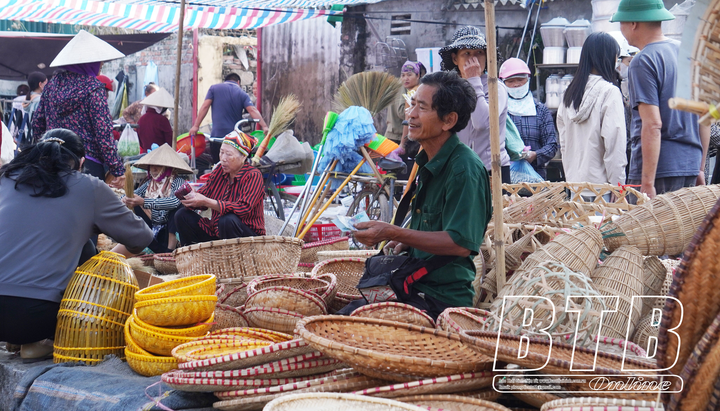 Các sản phẩm mây tre đan của làng nghề Nguy.ên Xá được bày bán tại chợ Thông, xã Hòa Bình (Vũ Thư).