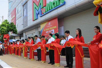 Các đồng chí Nguyễn Hồng Diên, Ủy viên B.T.V Tỉnh ủy, trưởng ban Tuyên giáo Tỉnh ủy; Đặng trọng Thăng, Ủy viên B.T.V Tỉnh ủy, Phó trưởng ban Tổ chức Tỉnh ủy; đại diện các đồng chí lãnh đạo Tổng công ty Dệt may Việt Nam, Tổng công ty May 10, cắt băng khai trương siêu thị.