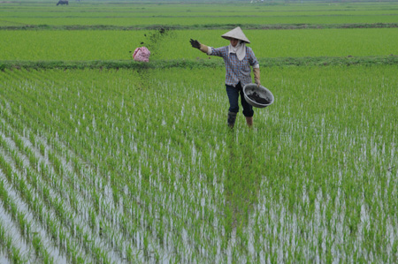 Nông dân xã Đông Xuân - Đông Hưng chăm bón lúa xuân. Ảnh: Minh Đức