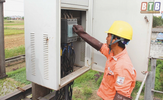 Công nhân Công ty Điện lực Thái Bình kiểm tra hoạt động của trạm biến áp, bảo đảm cung cấp điện ổn định, an toàn.