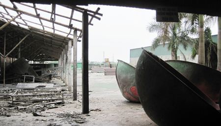 Thời điểm chúng tôi đến các cơ sở sản xuất bể biôga từ nhựa composite, các đơn vị này đã nhận được thông báo của UBND huỵên Đông Hưng yêu cầu tạm dừng sản xuất được ít ngày. Tại cụm công nghiệp Đông La, Công ty TNHH Hưng Việt Composite đã dừng sản xuất trước khi có thông báo của UBND huyện hơn 1 tháng nay. Cơ sở sản xuất hoang tàn, nhà xưởng thu dỡ dở dang, không còn một bóng công nhân làm việc, đó là những gì chúng tôi được chứng kiến. Từ năm 2008 Công ty này đã được ông Lưu Văn Hạnh cho thuê lại đất từ dự án đăng ký mở rộng sản xuất kinh doanh cơ khí, sửa chữa trung đại tu ô tô xe máy, máy nông nghiệp, kinh doanh đồ gia dụng, vật liệu xây dựng.