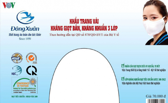 Đại diện Tập đoàn Dệt May Việt Nam cho biết, để tiếp tục chuẩn hóa sản phẩm khẩu trang bằng các hướng dẫn chuyên ngành, đảm bảo quyền lợi cho người tiêu dùng, Tập đoàn Dệt May Việt Nam đã sản xuất thử nghiệm và kiểm định thành công sản phẩm khẩu trang mới với tên gọi “khẩu trang vải kháng giọt bắn, kháng khuẩn 3 lớp”. Lớp ngoài là vải dệt thoi kháng nước, kháng bụi, kháng khuẩn công nghệ nano bạc của Dệt Kim Đông Phương, 2 lớp trong là vải dệt kim kháng khuẩn của Dệt Kim Đông Xuân, được Viện Trang thiết bị và Công trình Y tế cấp giấy chứng nhận thử nghiệm khẩu trang vải đạt các thông số kỹ thuật về Ngoại quan, Hiệu suất lọc, Trở lực hô hấp và giới hạn cho phép của các kim loại nặng.