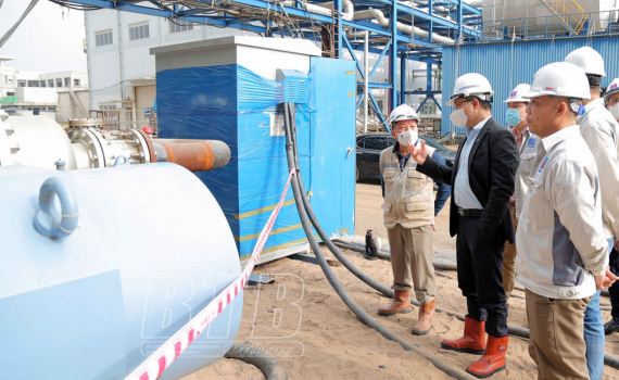 Lãnh đạo Tập đoàn Dầu khí Việt Nam kiểm tra khu vực chạy thử súc rửa đường ống hệ thống nước.