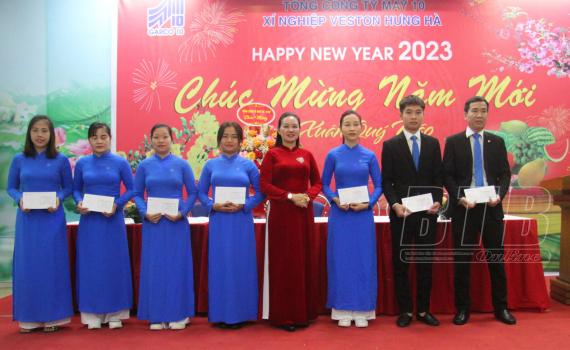 Lãnh đạo Xí nghiệp Veston Hưng Hà trao thưởng cho các công nhân, tổ, phân xưởng có thành tích xuất sắc trong thi đua lao động năm 2022.