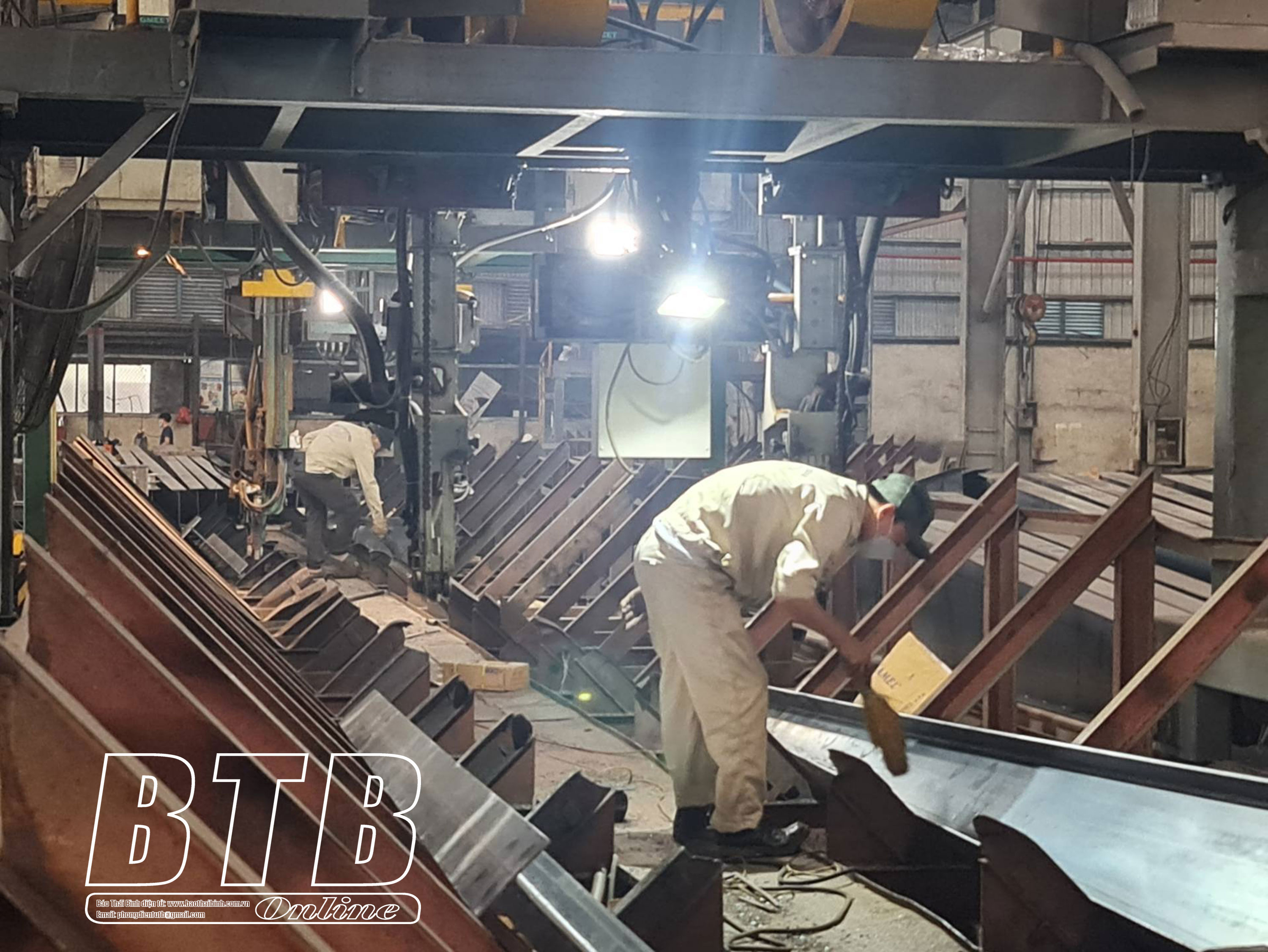Các công nhân đang hoàn thiện cấu kiện nhà thép tiền chế.