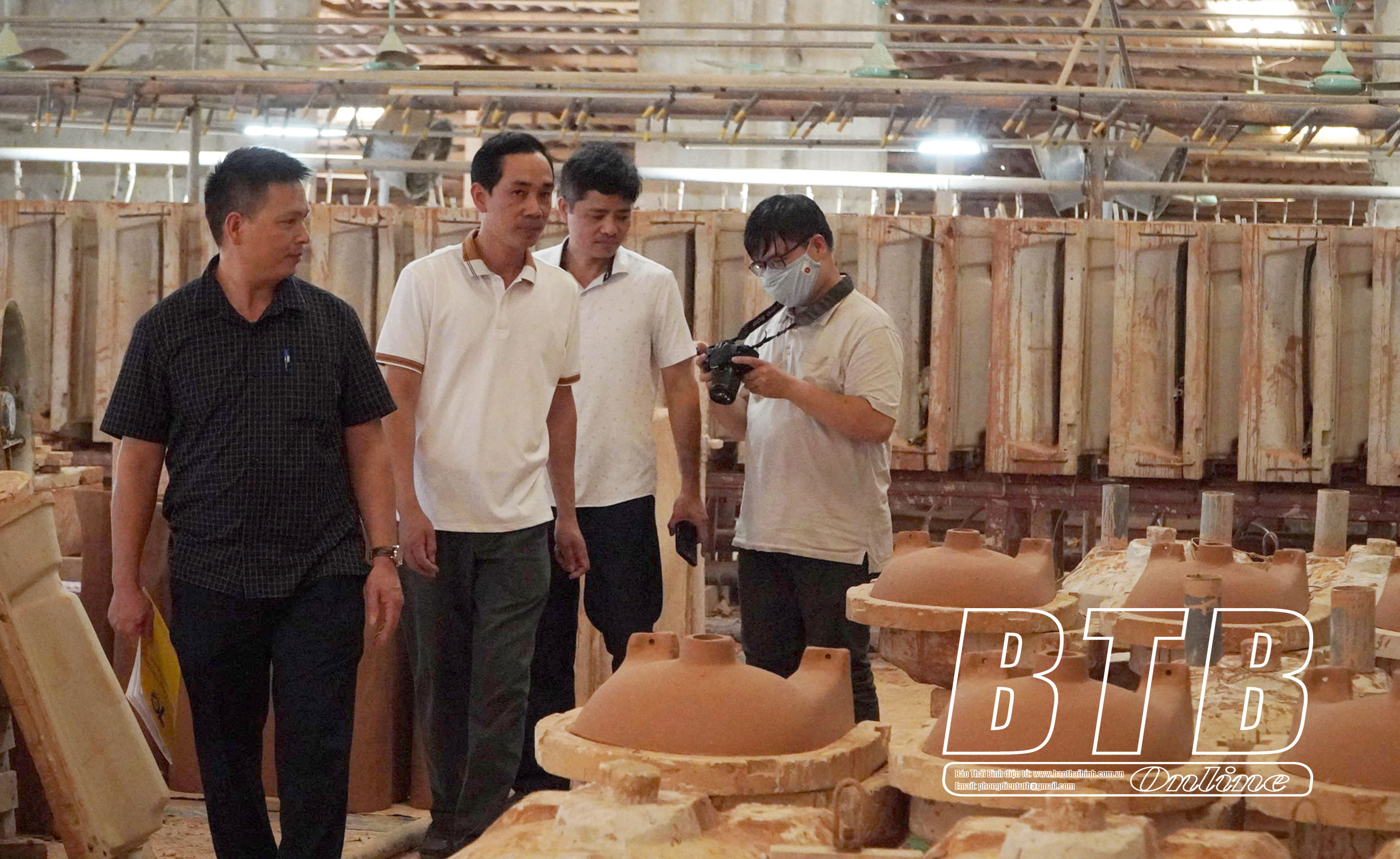 Cán bộ Trung tâm Khuyến công - Tư vấn phát triển công nghiệp cùng lãnh đạo Công ty Cổ phần Hải Ngọc đi kiểm tra, đánh giá hiệu quả sản xuất sau đổi mới công nghệ.