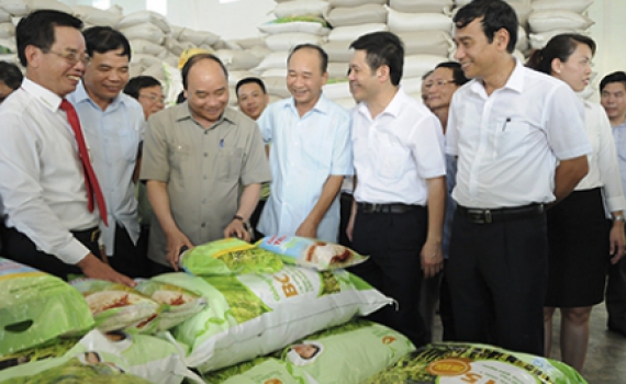 Đồng chí Nguyễn Xuân Phúc, Ủy viên Bộ Chính trị, Thủ tướng Chính phủ cùng các đồng chí lãnh đạo tỉnh thăm nhà máy chế biến hạt giống thuộc Công ty Cổ phần Tổng công ty Giống cây trồng Thái Bình tại xã Vũ Chính (thành phố Thái Bình). Ảnh: Thành Tâm