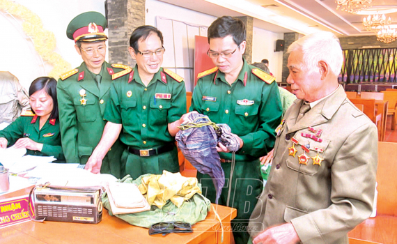 Hội viên Ban liên lạc Cựu chiến binh Cục Hậu cần Miền B2 tỉnh Thái Bình trao tặng hiện vật cho Bảo tàng Hậu cần.