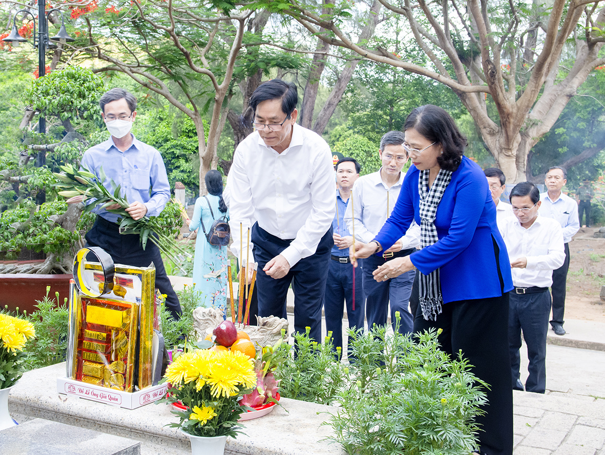 Ông Phạm Viết Thanh, Ủy viên Trung ương Đảng, Bí thư Tỉnh ủy, Chủ tịch HĐND tỉnh; bà Nguyễn Thị Yến, Phó Bí thư Thường trực Tỉnh ủy, Trưởng Đoàn ĐBQH tỉnh dâng hương tại phần mộ Nhà yêu nước Nguyễn An Ninh.