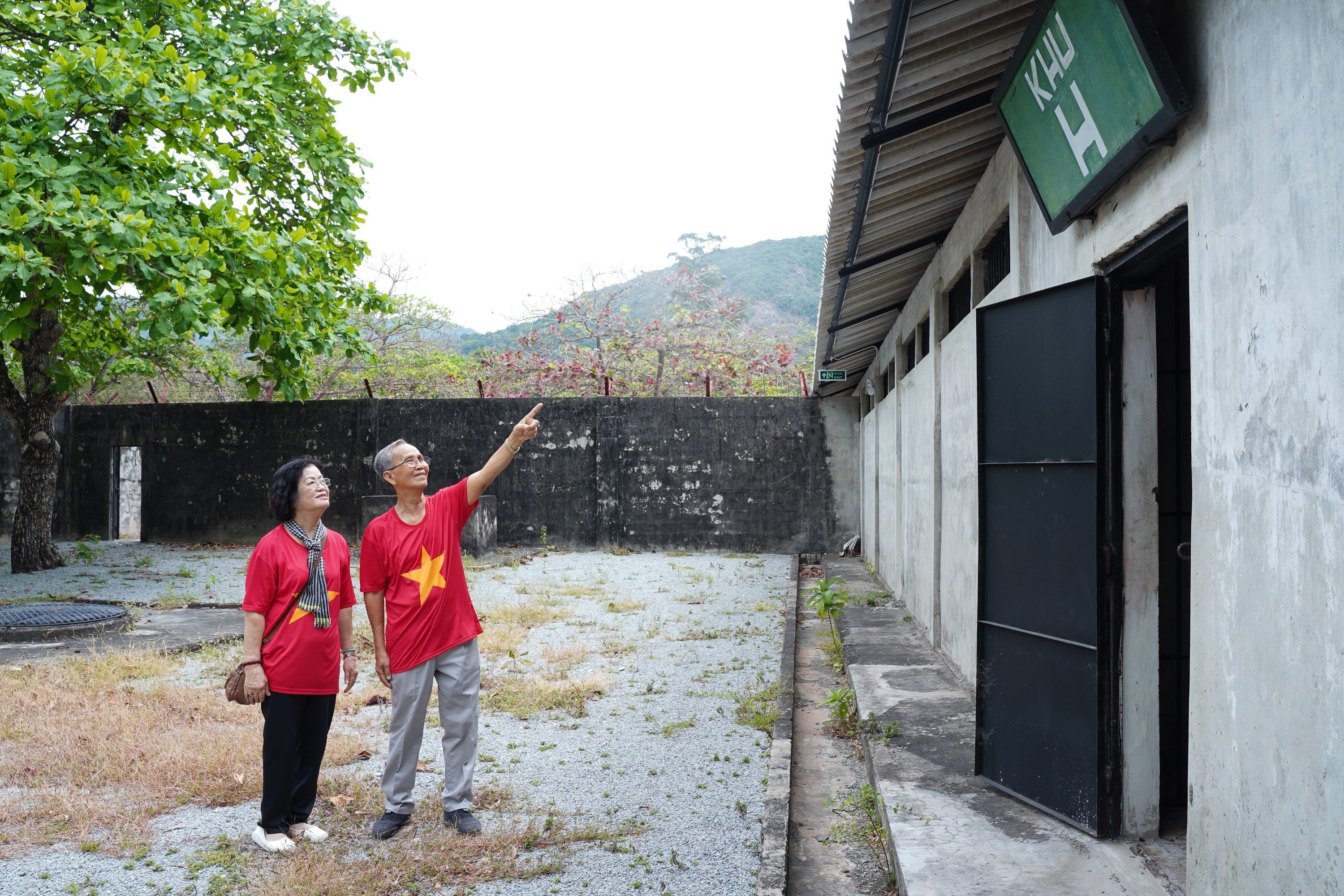 Anh hùng Lực lượng vũ trang Nhân dân Võ Văn Em cùng vợ là bà Đặng Thị Nga (đều là cựu tù chính trị Côn Đảo) thăm lại Khu H, Trại Phú Bình hay còn gọi là Chuồng cọp kiểu Mỹ, nơi từng giam giữ ông Võ Văn Em. Ảnh: MẠNH CƯỜNG