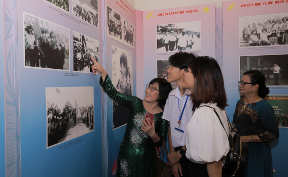 Cựu tù chính trị Huỳnh Thị Bền (tỉnh Bình Thuận) giới thiệu tấm hình có mặt của bà trong ngày Côn Đảo được giải phóng với đoàn viên, thanh niên Côn Đảo. Ảnh: MẠNH CƯỜNG