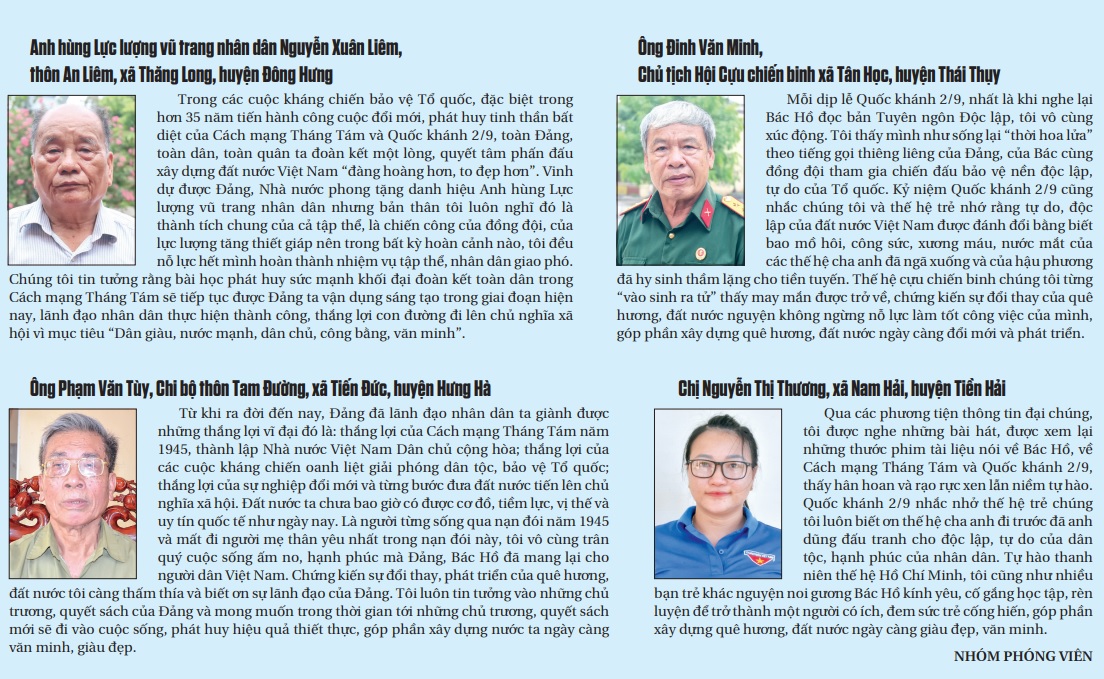 78 năm đã đi qua nhưng những cảm xúc về ngày Tết Độc lập vẫn vẹn nguyên trong mỗi thế hệ người dân Việt Nam nói chung, người dân Thái Bình nói riêng; là tài sản tinh thần vô giá làm nên quyết tâm, ý chí vượt mọi khó khăn, gian khổ góp sức xây dựng quê hương ngày càng giàu đẹp, văn minh.