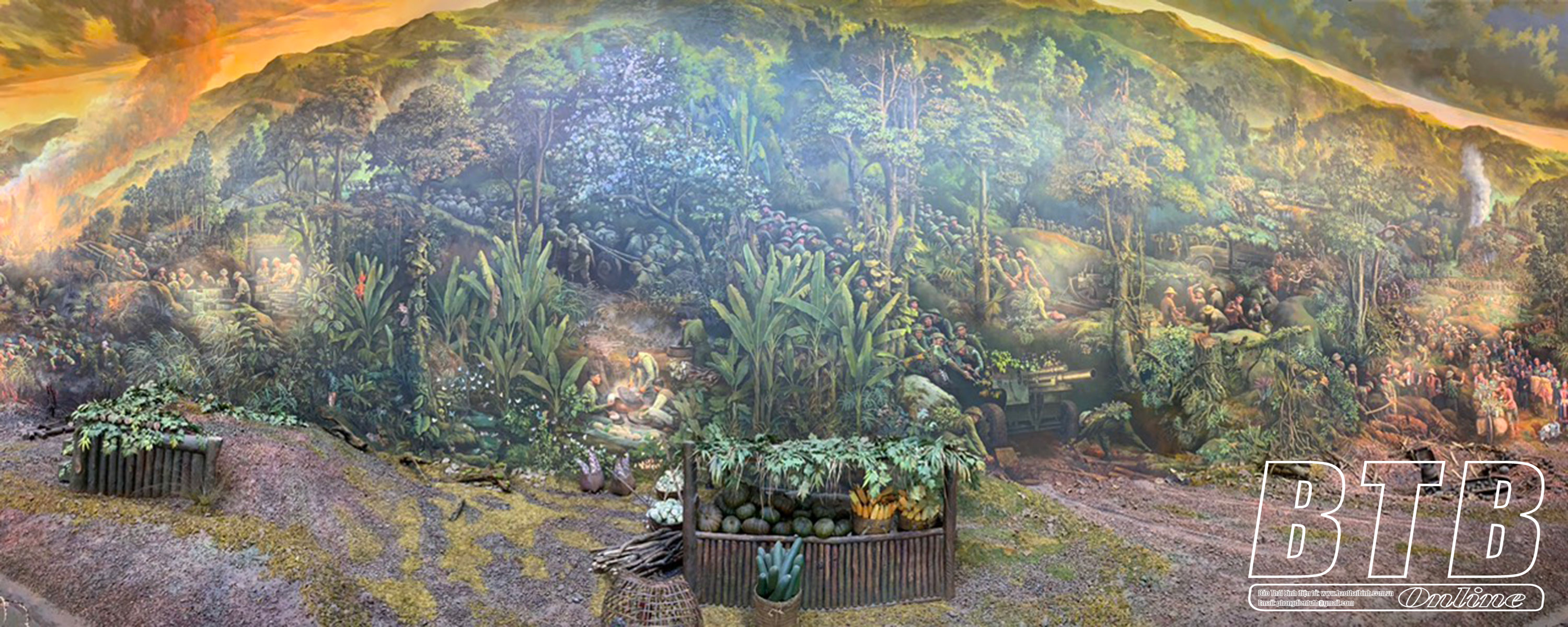 Bức tranh Panorama tại Bảo tàng Chiến thắng Điện Biên Phủ tái hiện lại hình ảnh kéo pháo vào trận địa của quân đội Việt Minh.