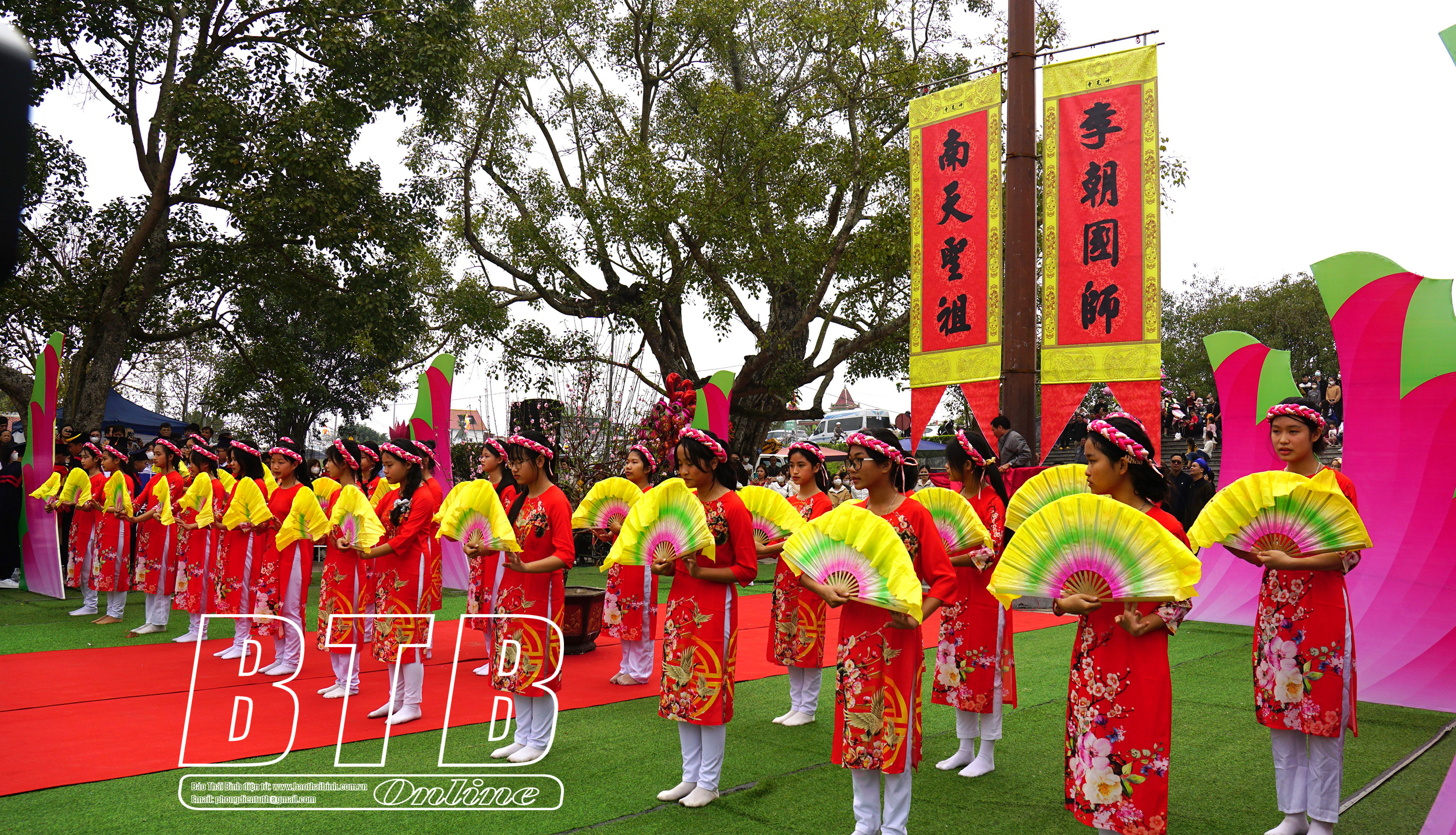 Các em học sinh tham gia biểu diễn tại chương trình khai bút đầu xuân trong lễ hội chùa Keo.
