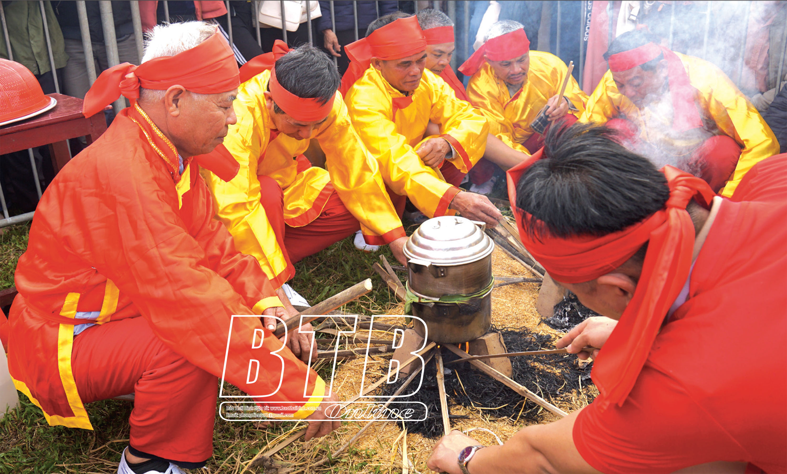 Các đội dâng mâm cơm đã hoàn thành trong hội thi kéo lửa thổi cơm lên lễ Phật, lễ Thánh.