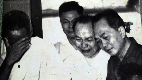 Đại tướng Võ Nguyên Giáp (ngoài cùng bên phải) và lãnh đạo Đảng, Nhà nước bật khóc khi Chủ tịch Hồ Chí Minh qua đời. Ảnh tư liệu