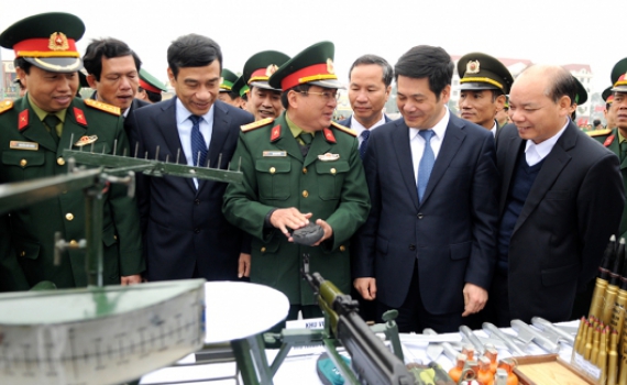 Các đồng chí lãnh đạo tỉnh tham quan mô hình học cụ phục vụ cho công tác huấn luyện trưng bày tại lễ ra quân huấn luyện. Ảnh: Thành Tâm