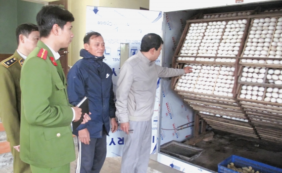 Đội kiểm dịch lưu động liên ngành huyện Thái Thụy kiểm tra hoạt động sản xuất, kinh doanh giống tại cơ sở ấp trứng gia cầm trên địa bàn xã Thụy Liên. Ảnh: Trần Tuấn