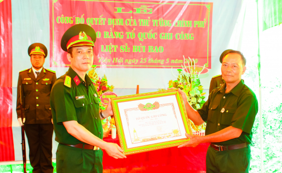 Đại tá Khiếu Quang Bình, Phó Chính ủy Bộ CHQS tỉnh trao bằng Tổ quốc ghi công cho gia đình liệt sĩ Bùi Bao.