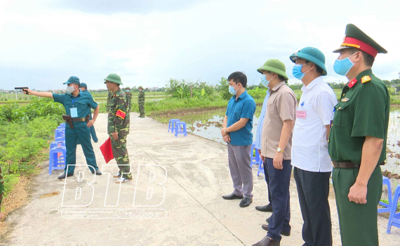 Các đồng chí lãnh đạo huyện kiểm tra, động viên các thí sinh thi thực hành bắn súng ngắn.