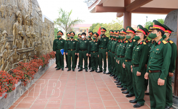 Cán bộ, chiến sĩ các đơn vị lực lượng vũ trang tỉnh học tập truyền thống tại nhà bia nơi thành lập Tỉnh đội Dân quân Thái Bình tại xã Vũ Quý (Kiến Xương).