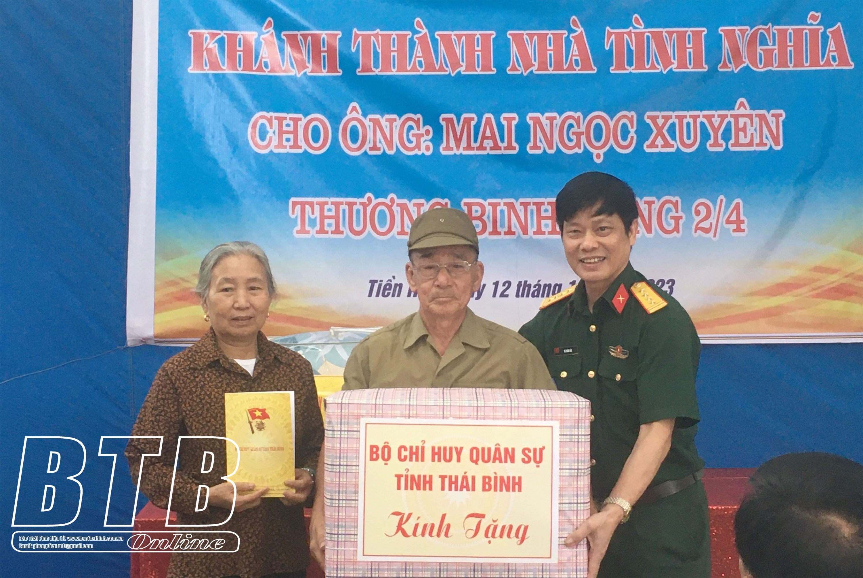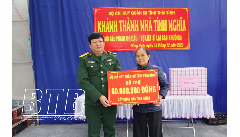 Trong tháng 12/2023, Bộ CHQS tỉnh, Ban CHQS huyện đã tổ chức khánh thành nhà tình nghĩa cho gia đình bà Phạm Thị Dậu, là vợ liệt sĩ Lại Cao Khuông, thôn Nam Đồng Hải, xã Đông Vinh (Đông Hưng) trong không khí rất phấn khởi.