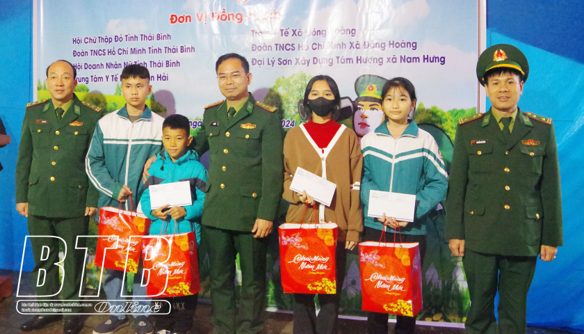 Theo đó, Đồn Biên phòng Cửa Lân, BĐBP Thái Bình, UBND xã Đông Hoàng đã phối hợp tổ chức nhiều hoạt động ý nghĩa, mang đậm bản sắc văn hóa của đồng bào vùng biên, như: Thăm, khám bệnh, cấp thuốc cho người già, phụ nữ, trẻ em trên địa bàn; phối hợp với Hội Doanh nhân nữ tỉnh, Tỉnh đoàn trao tặng 80 suất quà, trong đó 20 suất quà trị giá 500 nghìn đồng, 20 suất quà trị giá 300 nghìn đồng, 40 suất quà trị giá 400 nghìn đồng, gồm thực phẩm thiết yếu cho ngày tết; 4 suất quà cho chương trình “Con nuôi đồn Biên phòng, nâng bước em tới trường". Tổng trị giá tiền, quà từ chương trình gần 50 triệu đồng từ ngân sách và vận động từ các tổ chức, cá nhân mạnh thường quân, nhà tài trợ…