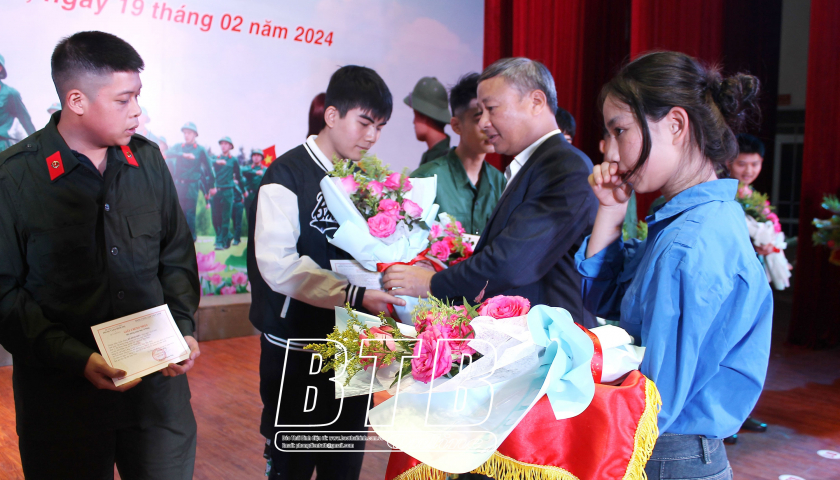 Nhân dịp này, các đồng chí lãnh đạo Huyện ủy, UBND huyện đã trao quà, giấy chứng nhận bồi dưỡng nhận thức về Đảng cho đại diện tân binh các xã, thị trấn.