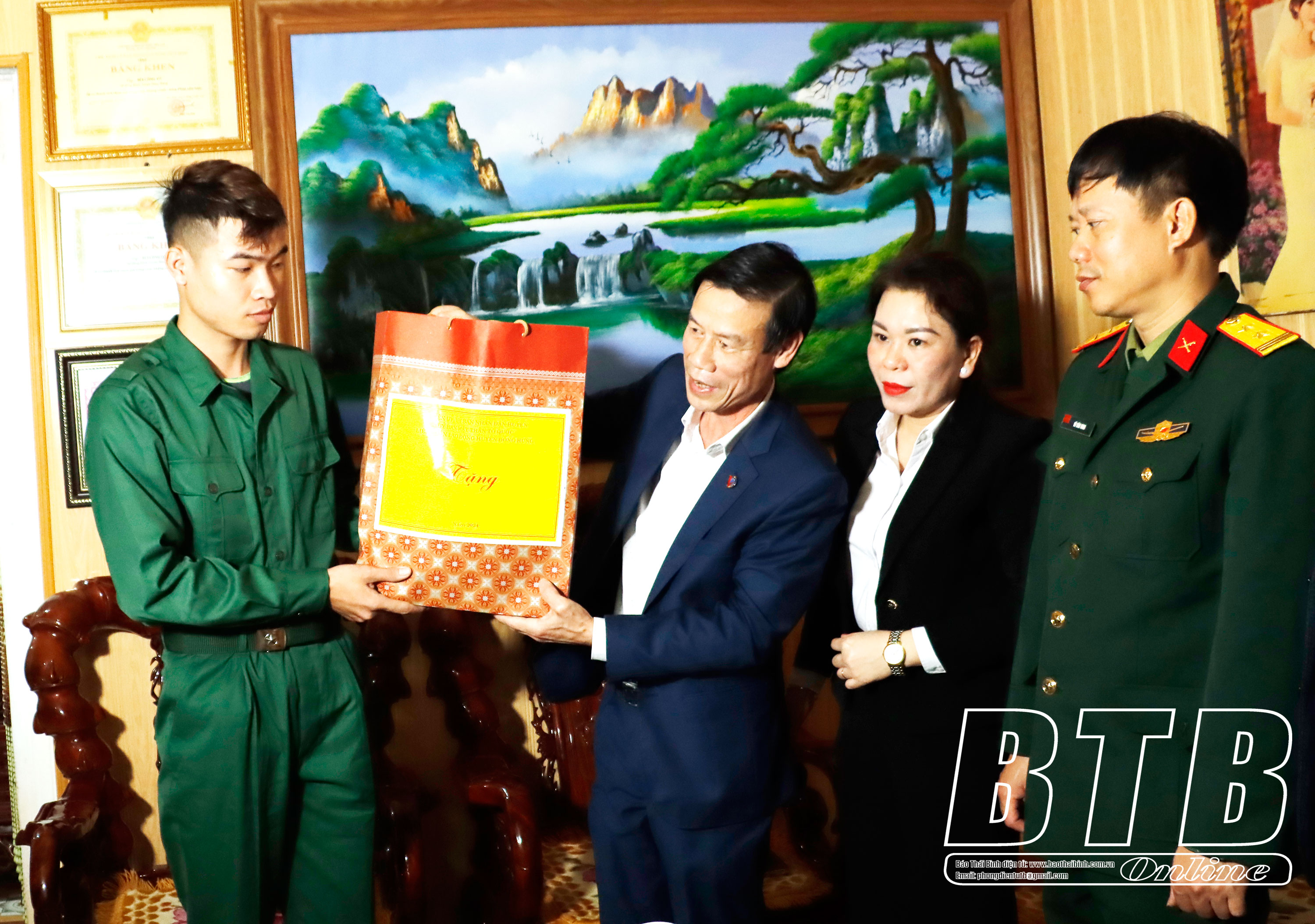Lãnh đạo huyện Đông Hưng tặng quà tân binh Bùi Anh Dũng, xã Minh Phú.