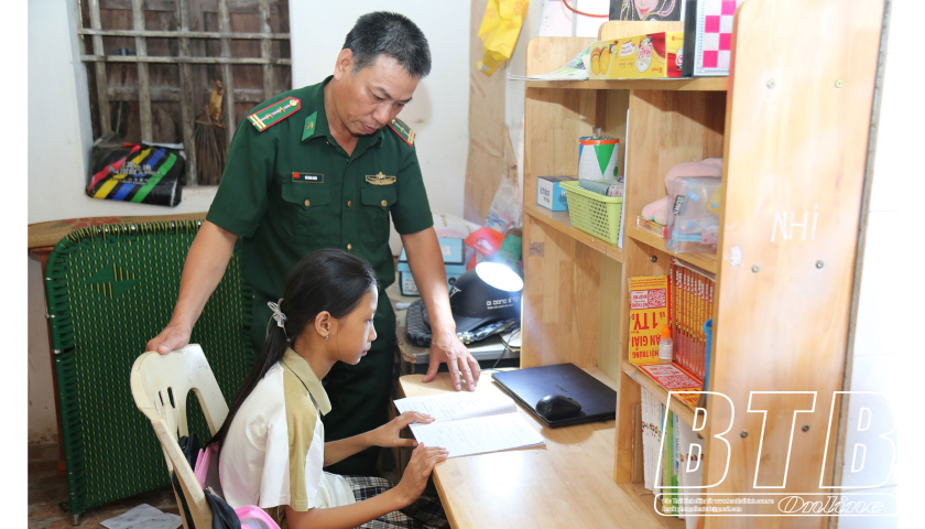 Trung tá Vũ Đăng Khân, Đồn Biên phòng cửa khẩu Cảng Diêm Điền thường xuyên động viên các con nuôi học hành chăm chỉ.