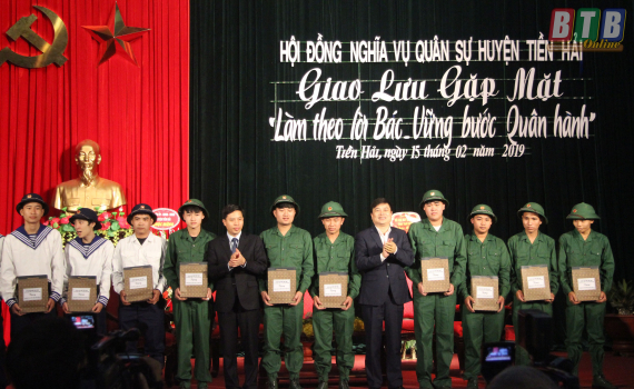 Lãnh đạo Huyện uỷ, UBND huyện Tiền Hải trao quà cho các thanh niên chuẩn bị nhập ngũ tại buổi giao lưu