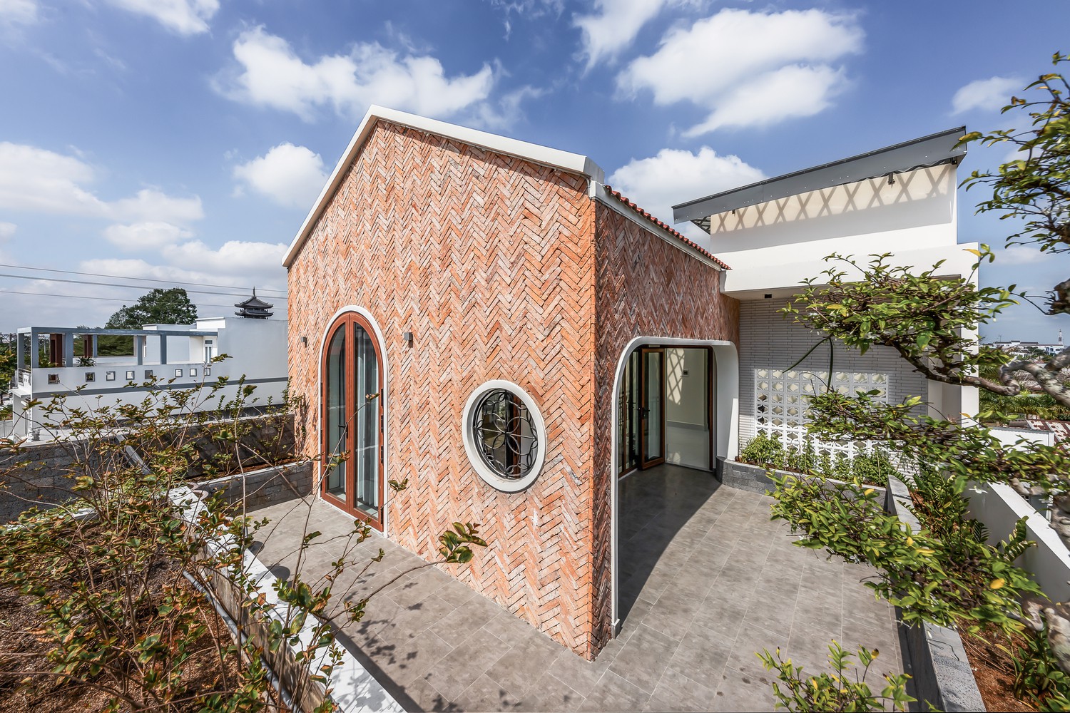 Gạch nung cũ được tái sử dụng. Màu gạch đỏ cùng họa tiết gạch ngoằn ngoèo tạo nên nét cá tính rất riêng. Các ô thoáng được bố trí ở những vị trí phù hợp để đón ánh sáng, thông gió tự nhiên.
