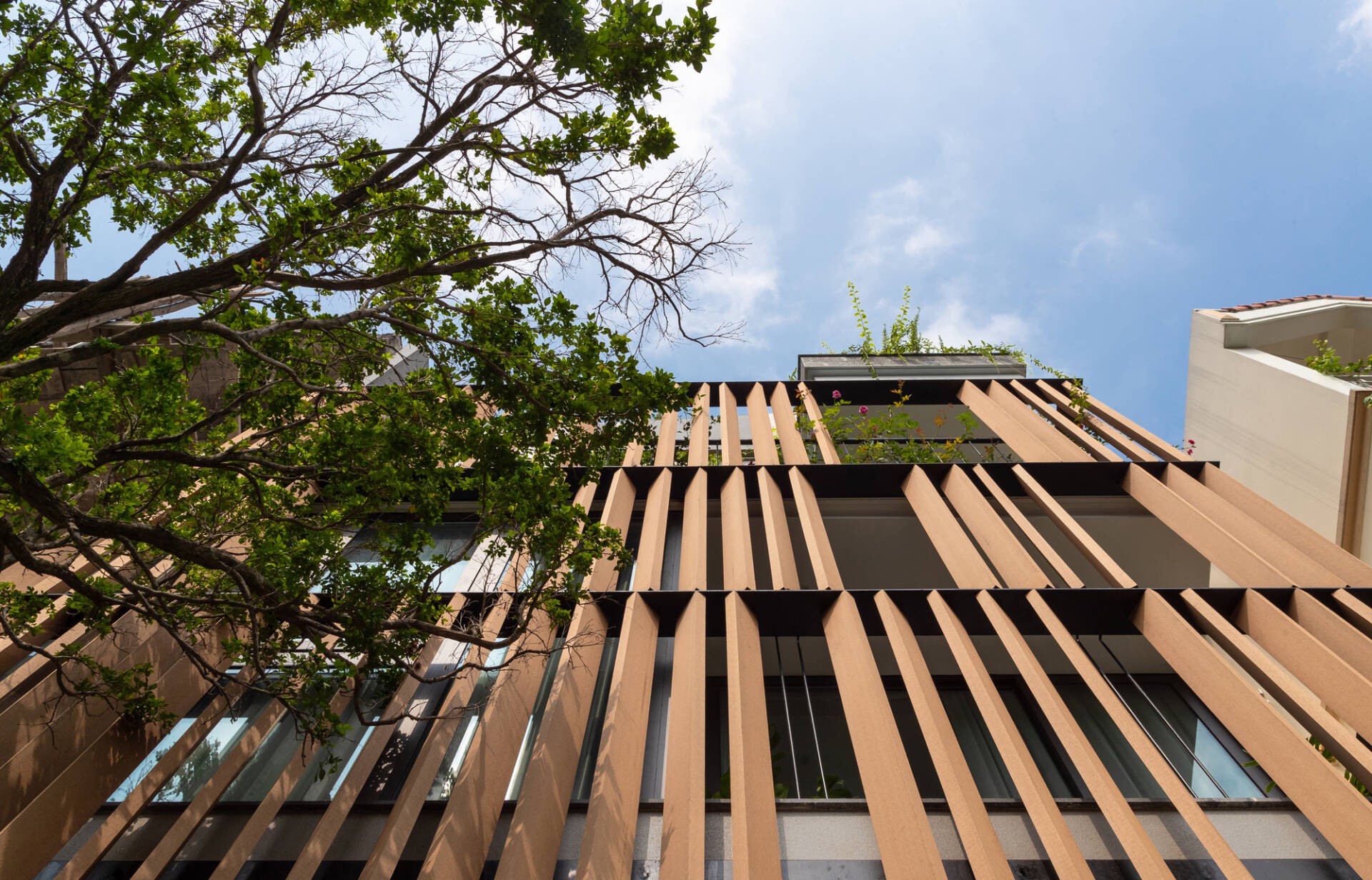 Nhờ đó, ngôi nhà như được “kéo dài hơn” khi quan sát gần từ dưới lên.