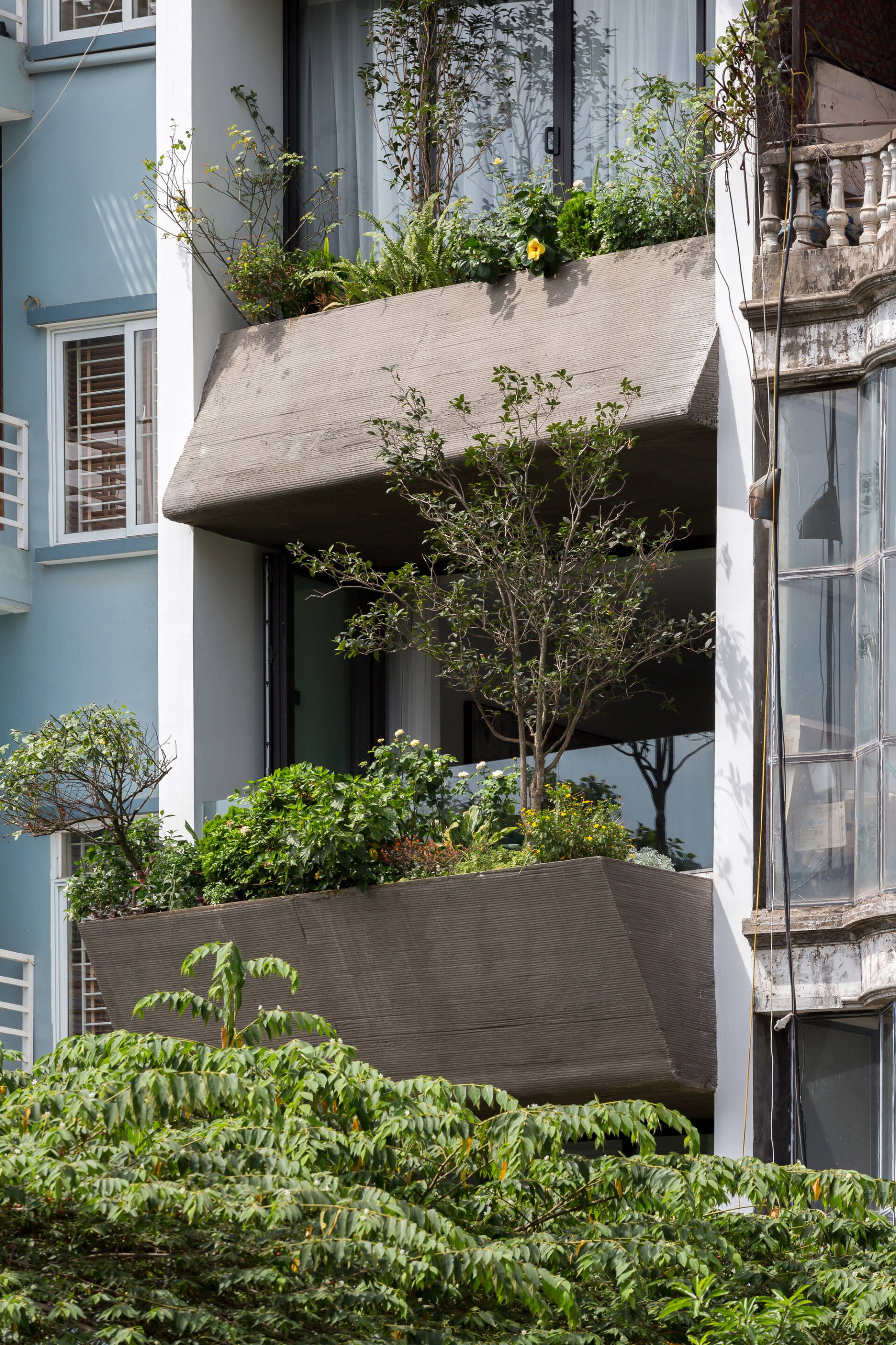 Những bồn cây bằng bê tông hình khối vát ngược chính là lớp cách nhiệt, ngăn khói bụi giúp không gian sống ở bên trong mát mẻ và trong lành hơn. Nhờ bồn cây, không gian thư giãn ngoài ban công trở nên thơ mộng hơn