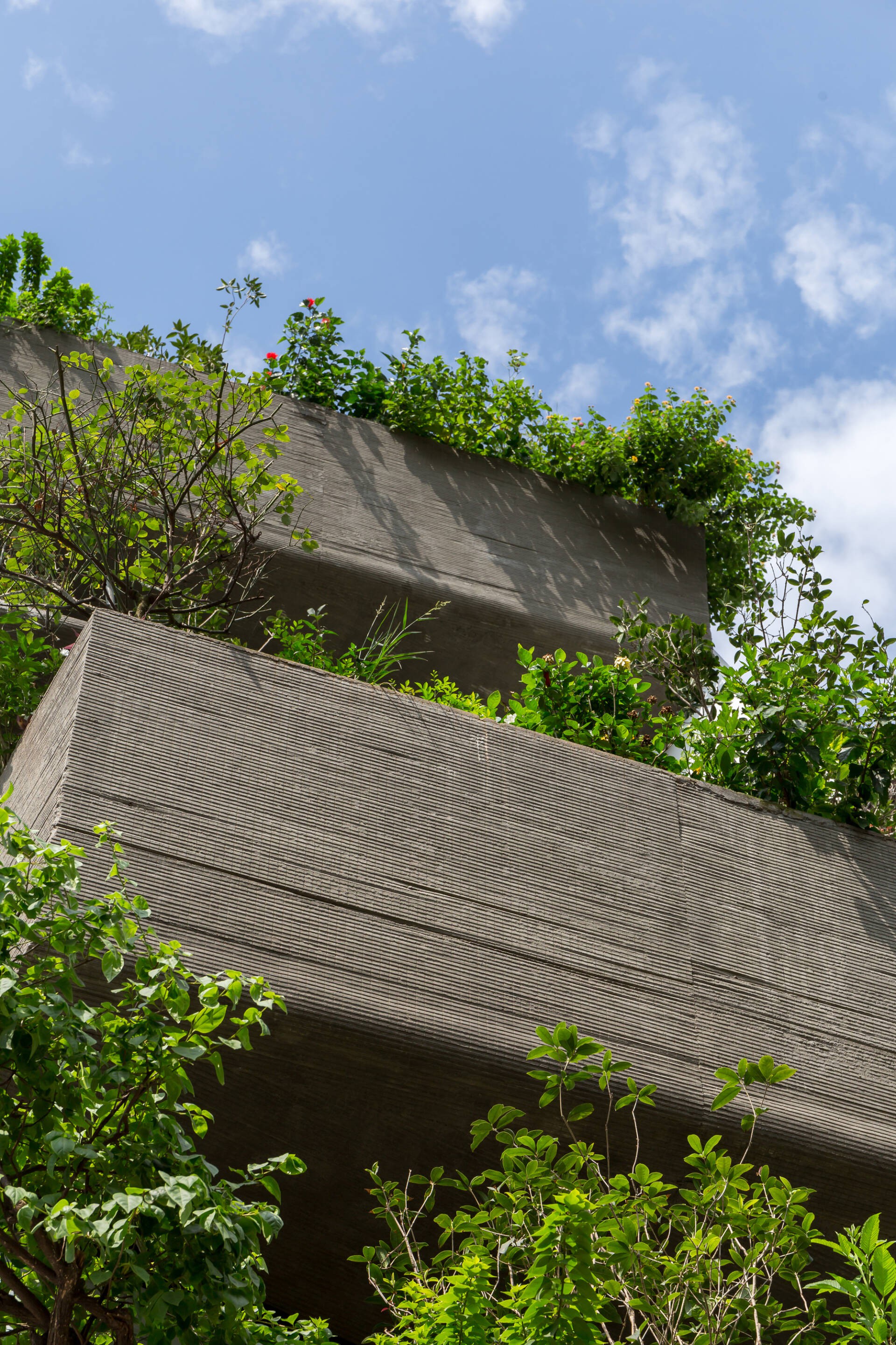 Để hạn chế ánh nắng gay gắt từ hướng tây nam, kiến trúc sư thiết kế “vườn ban công xanh mướt" vát so le ở các tầng.