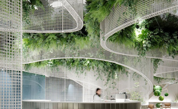 Điểm nhấn của toàn bộ khu vườn bay là những tấm lưới kim loại màu trắng được đặt cố định trên trần nhà. Chúng uốn lượn mềm mại như những dải ruy băng hay những đám mây trong cơn gió nhẹ. Nhờ tạo hình nghệ thuật, chúng di chuyển một cách uyển chuyển và thanh thoát bên trên quầy phục vụ hình bán nguyệt, các khu vực chỗ ngồi và những chậu cây gắn sẵn.