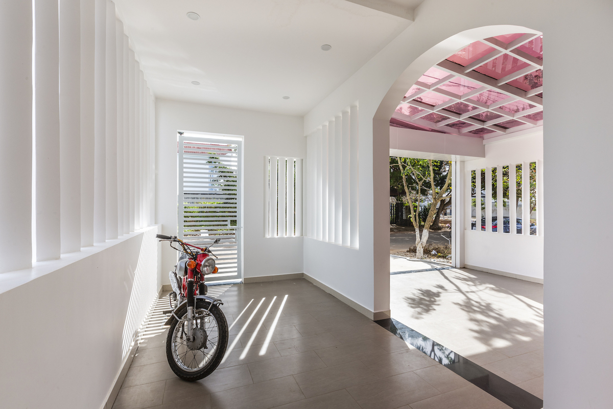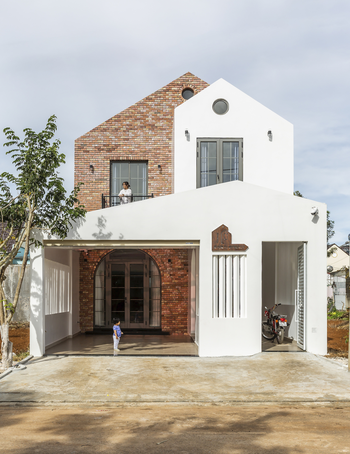 Nhờ hình khối vuông vắn và hiện đại hơn nguyên mẫu, công trình phù hợp với độ tuổi của gia chủ cũng như xu thế kiến trúc ngày nay. Màu trắng và màu gạch đỏ của mặt tiền giúp công trình nổi bật mà vẫn hòa hợp với bối cảnh xung quanh.