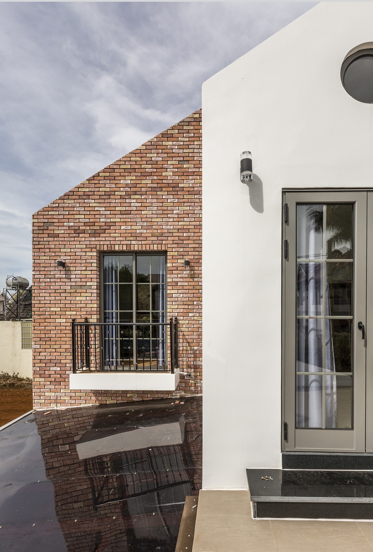 Nhìn từ phía ngoài, ngôi nhà đã thể hiện được những nét đặc trưng của hai công trình này qua mái nhọn và tường gạch.