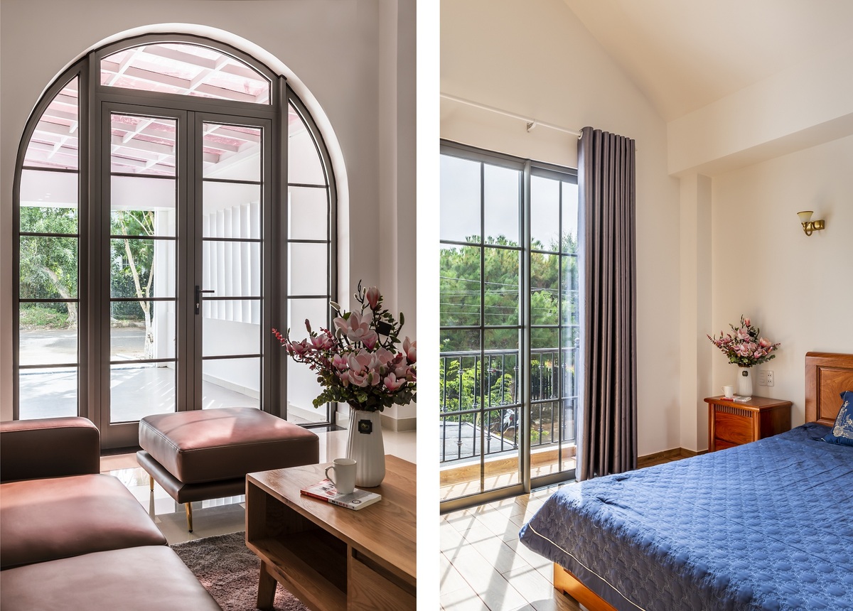 Khí hậu ở Đức Trọng ôn hòa, nhiệt độ trung bình 18-22 độ nhưng có nhiều ánh sáng. Để tận dụng ánh nắng tự nhiên, kiến trúc sư bố trí các ô cửa lớn ở cả không gian sinh hoạt chung lẫn phòng ngủ riêng tư. Nhờ đó, nhà sáng, ấm và tiết kiệm năng lượng.