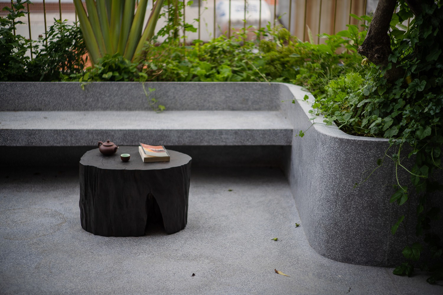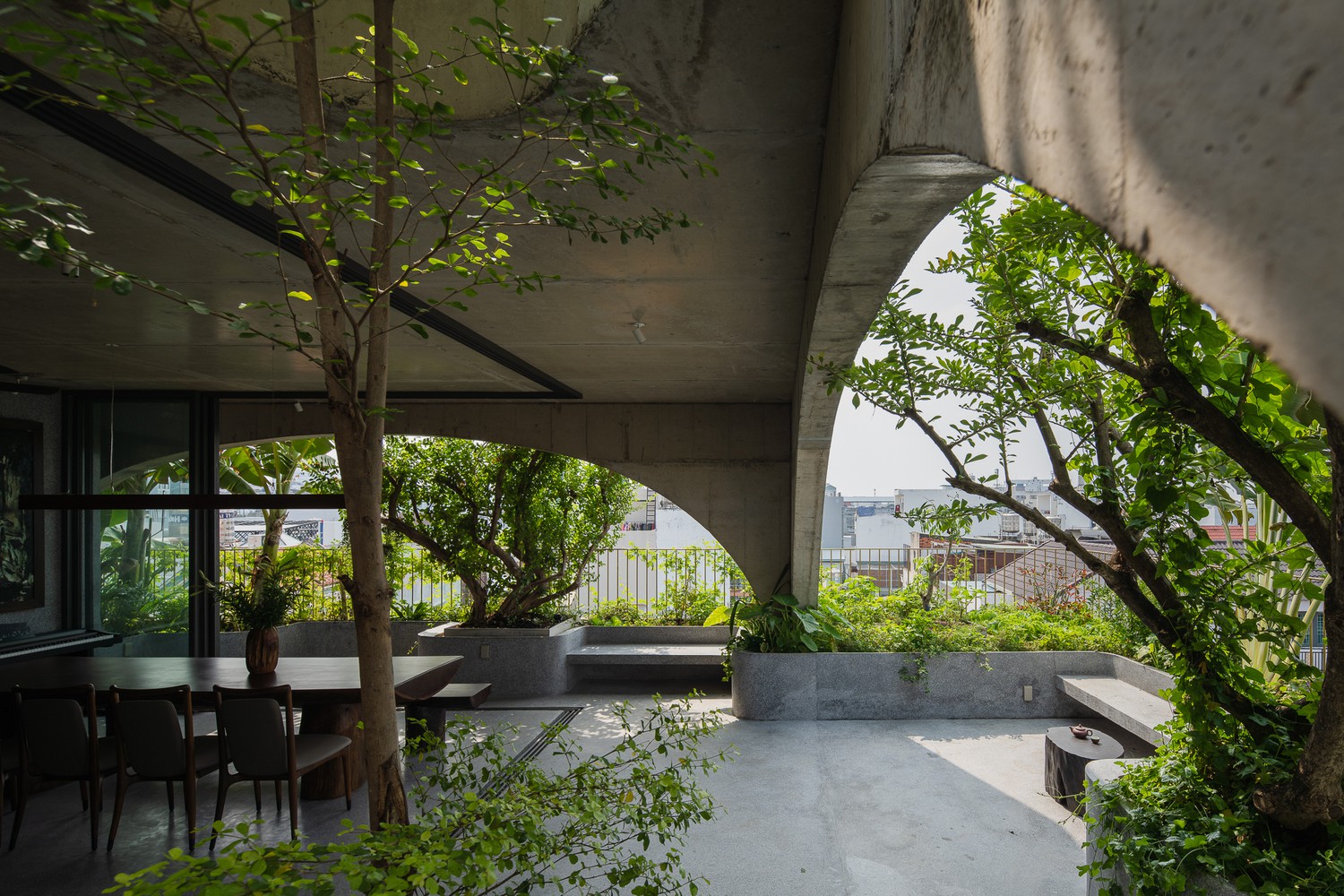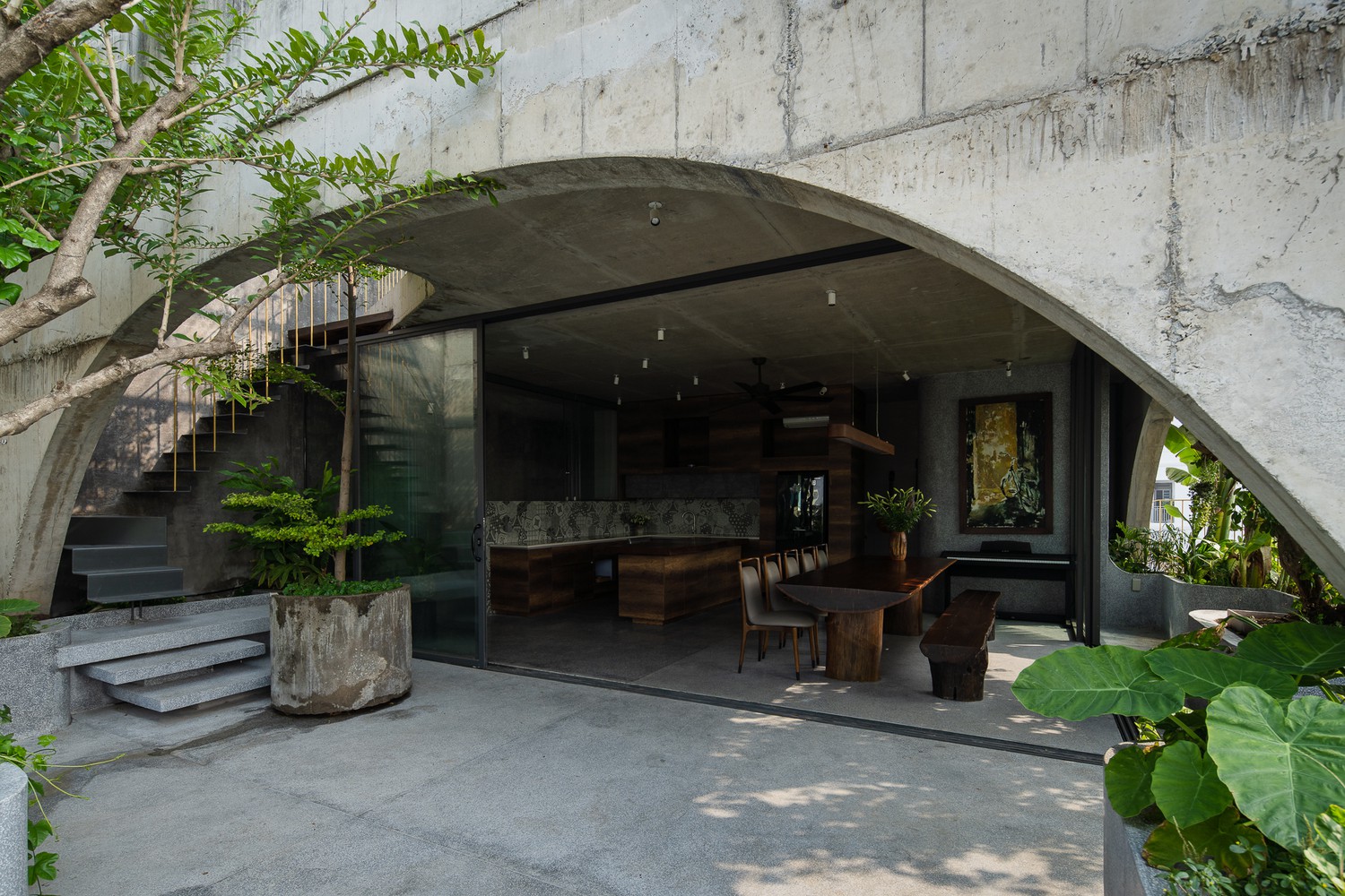 Không gian thoáng đãng đối lập với nhịp sống tĩnh lặng, ẩn hiện sau những bức tường bê tông hình vòng cung và vườn rau, cây ăn quả xung quanh. Nguồn ảnh: Quang Dam