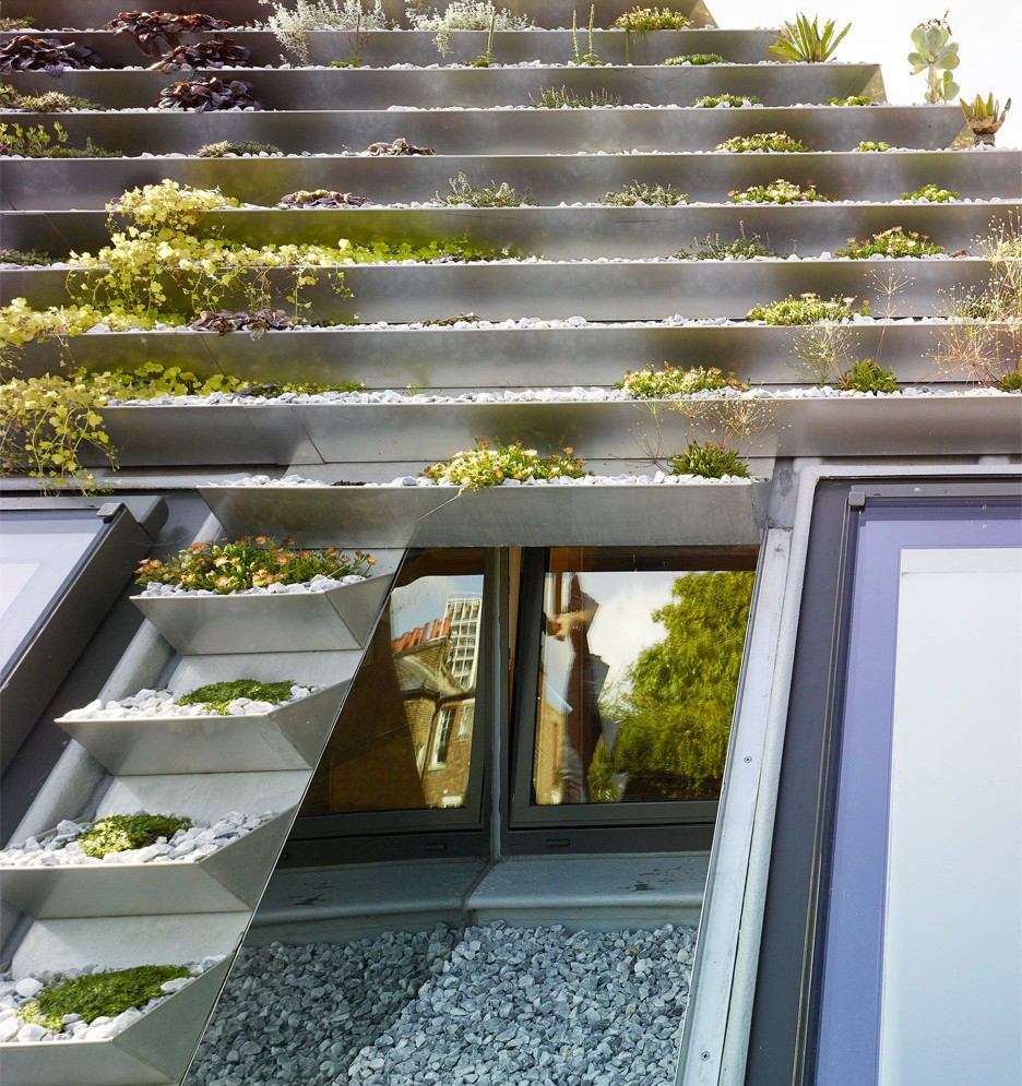 Nhằm tạo ra khu vườn, các kiến trúc sư đã gắn một loạt khay thép không gỉ lên mái nhà nghiêng 30 và 45 độ. Các cây được trồng vào trong khay, xung quanh rải đá cuội... Khu vườn không quá rộng nhưng các cây trồng nho nhỏ giúp gia chủ có một không gian đẹp mắt giữa phố thị đông đúc nhà cửa.