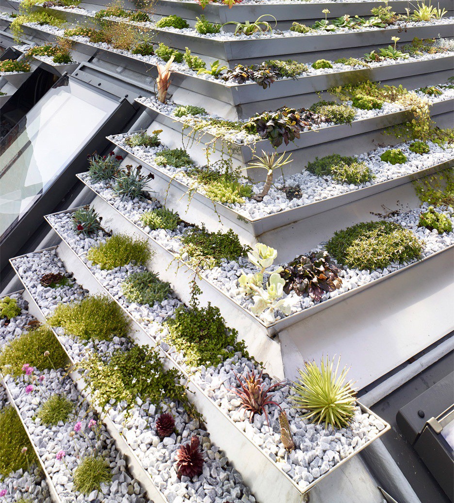 Mái nhà của Garden House dốc đứng như kim tự tháp. Với cách thiết kế này, chủ nhà có thể dễ dàng chăm sóc, tưới tắm cho các cây nhỏ. Giữa các cây có một khoảng cách nhất định, kích thước không quá to tạo nên nét đẹp riêng cho từng bậc thang.