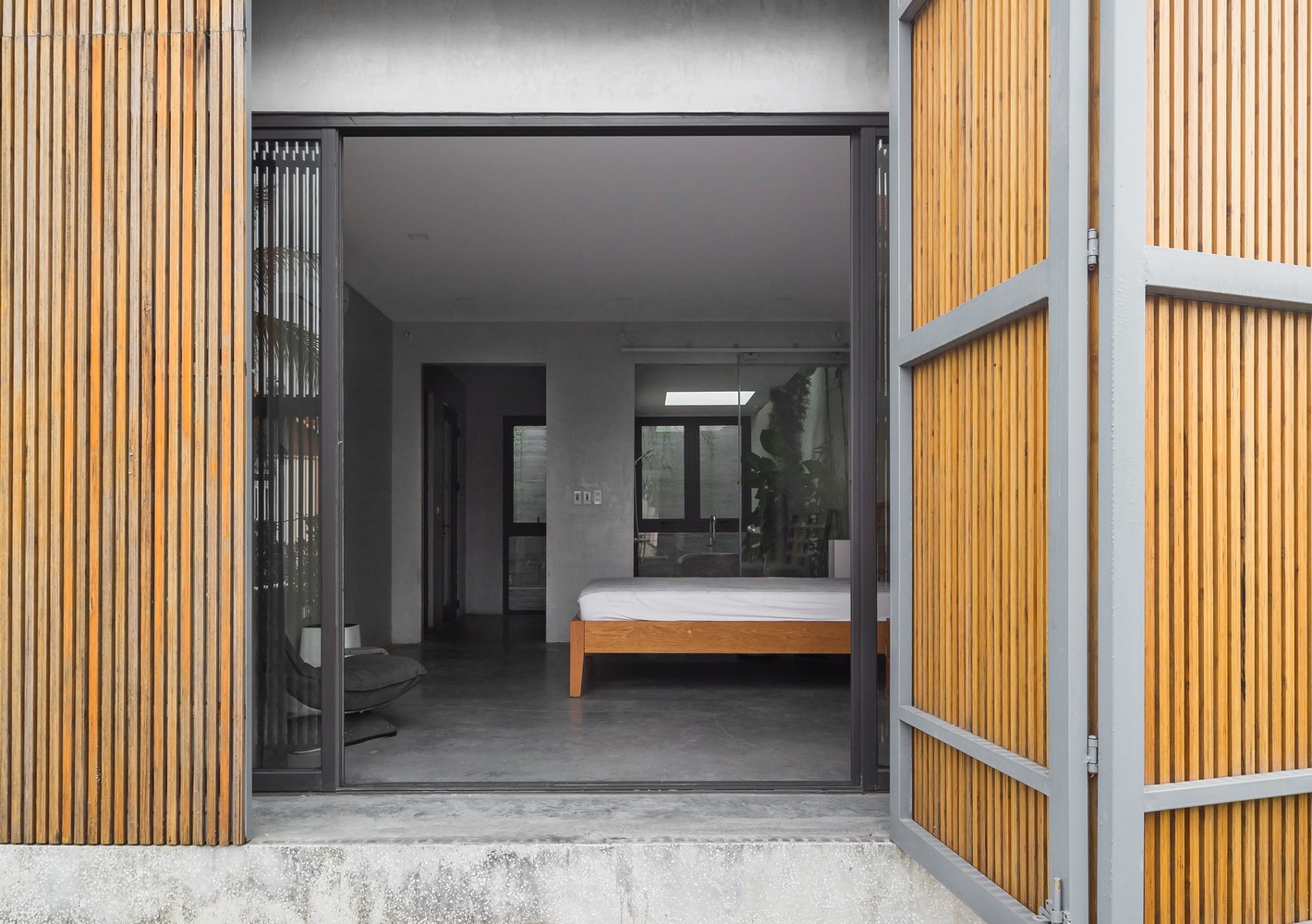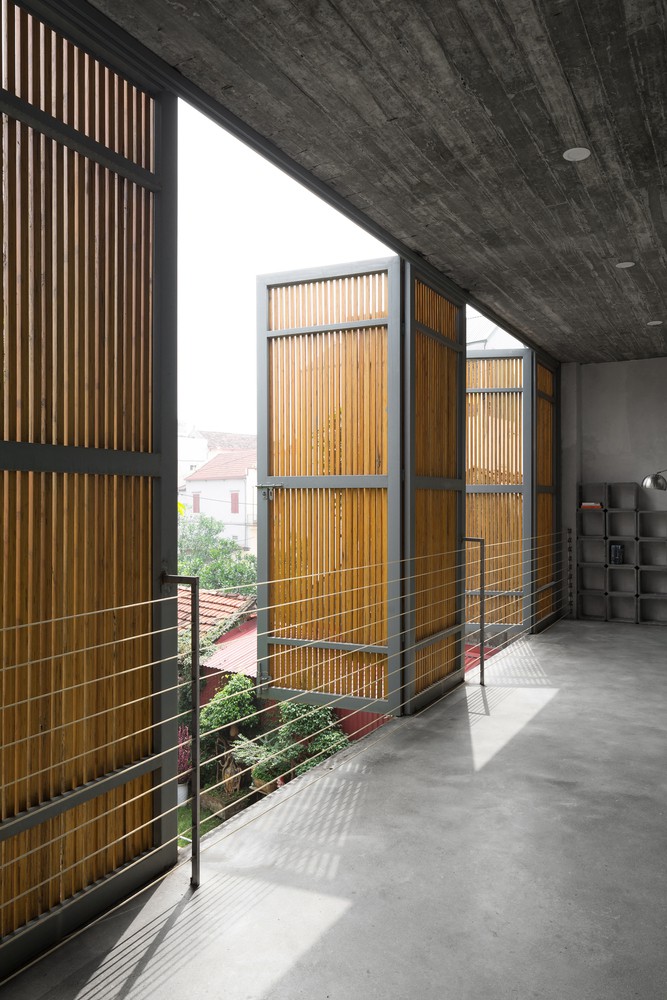 Mặt tiền ngôi nhà là hệ thống cửa nan tre ép khung sắt có thể đóng mở linh hoạt.