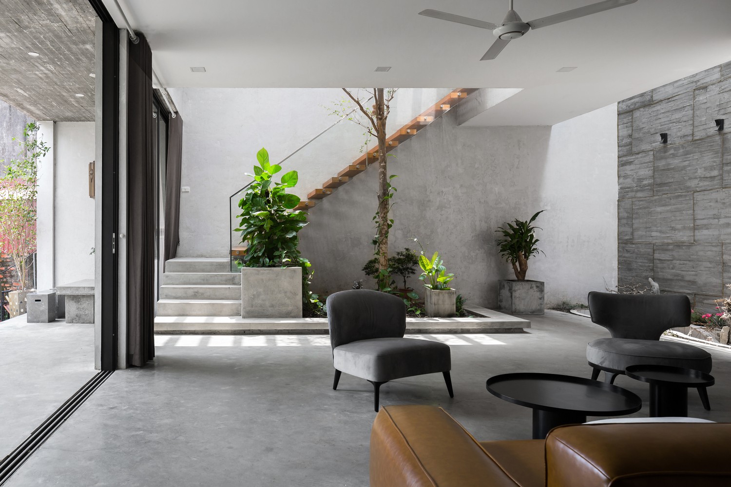 Với sự yêu thích bê tông của gia chủ, nhóm thiết kế chọn vật liệu hoàn thiện nhà chủ yếu là bê tông với bề mặt nhám, gỗ màu hạt dẻ giúp không gian trở nên ấm cúng hơn.